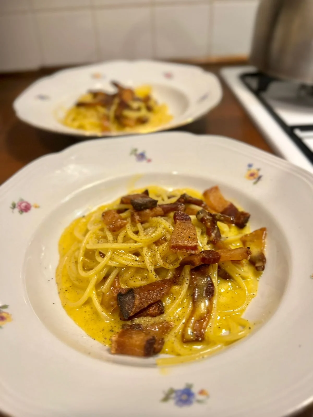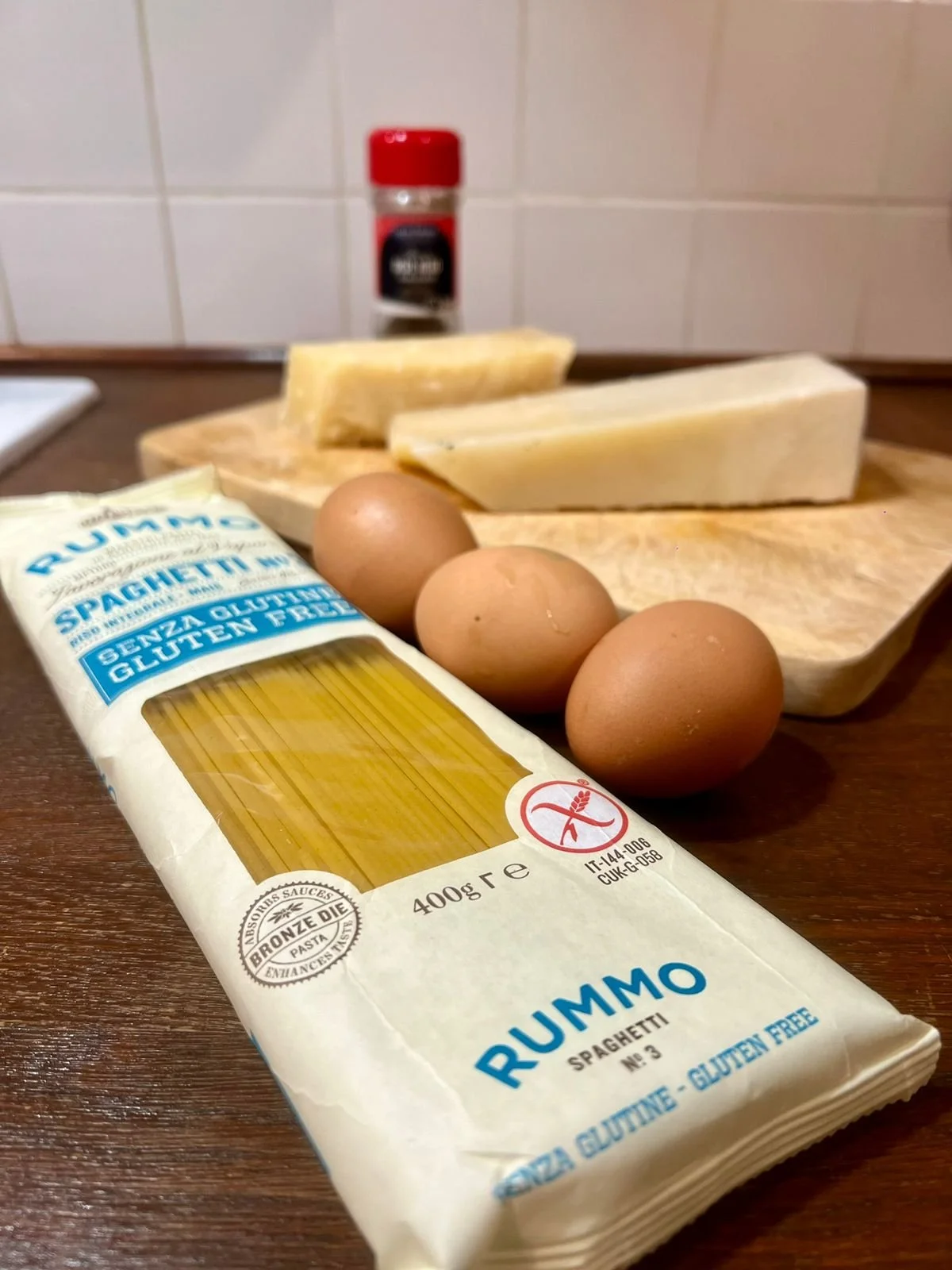 As receitas italianas partem de poucos ingredientes, mas é necessário técnica e bons ingredientes. A receita carbonara é feita com gemas de ovos, queijo ralado, pimenta preta, guanciale e água do cozimento. Muitas receitas levam apenas o queijo parmesão, mas aqui na Itália, o parmesão possui notas adocicadas, e a receita fica melhor com a mistura de queijo pecorino, que é mais salgado.