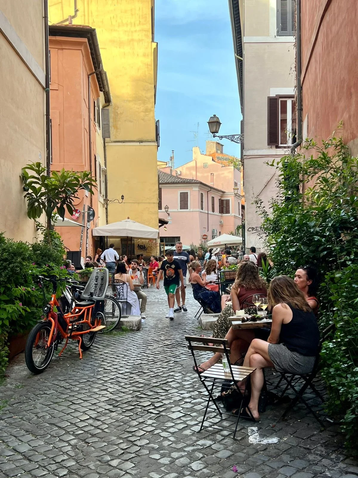 Começamos pelo bairro de Trastevere. Trastevere é um destino popular para os moradores locais e turistas, com uma variedade de restaurantes, bares, lojas de artesanato e mercados de rua. O bairro é boêmio e divertido, sobretudo para comer, beber e ouvir boa música.