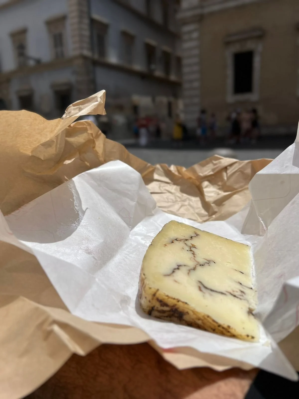 E foi por lá que eu pude matar a saudade de comer um queijo surreal de bom, que eu considero uma joia gastronômica. Ele é feito de leite sardo (da Sardenha) com tartufo nero (trufas negras). A fatia razoavelmente média custou quase 14 euros, o que não é barato, mas vale cada centavo de euro. Ele é levemente salgado e gorduroso, com um perfume intenso de trufas, que derrete na boca.